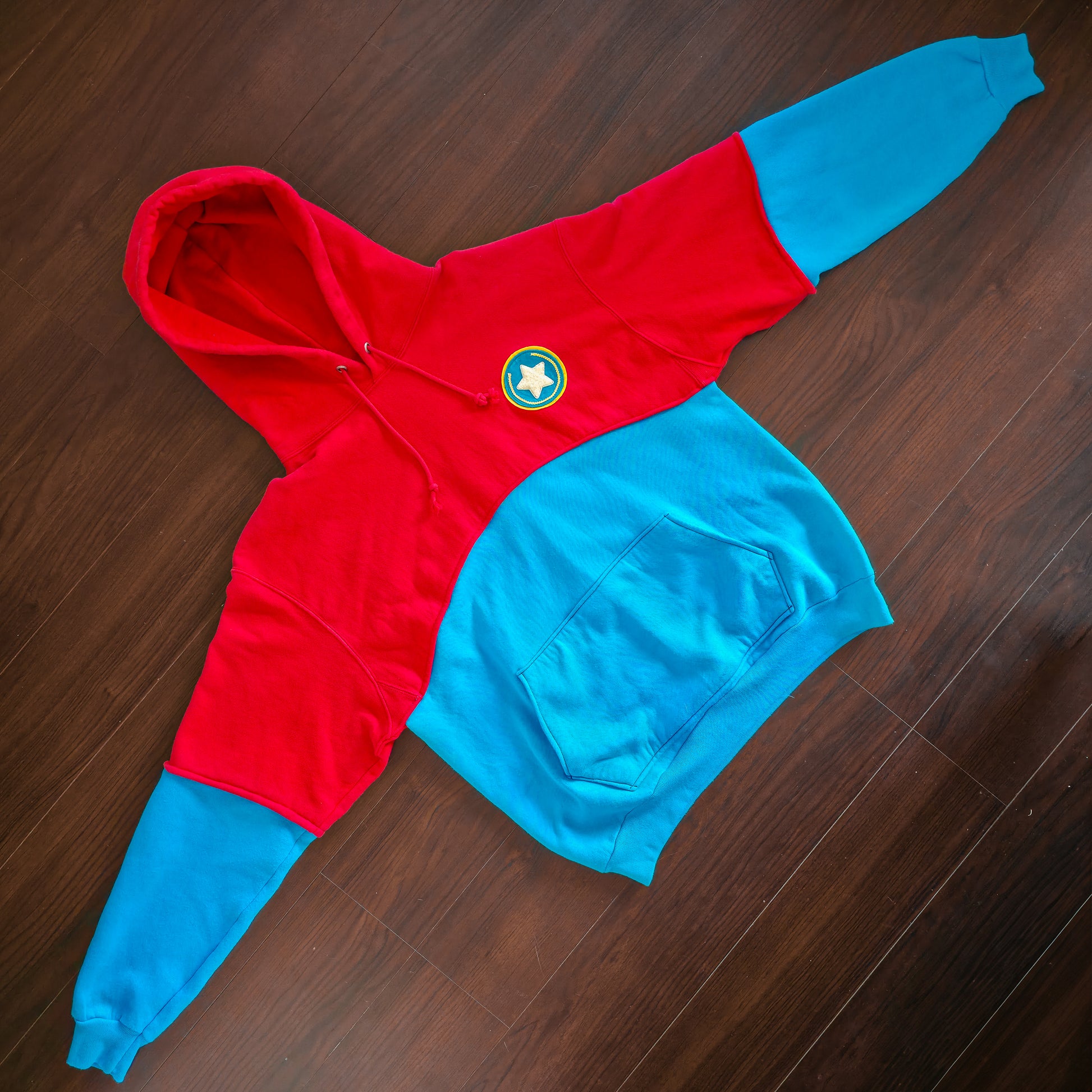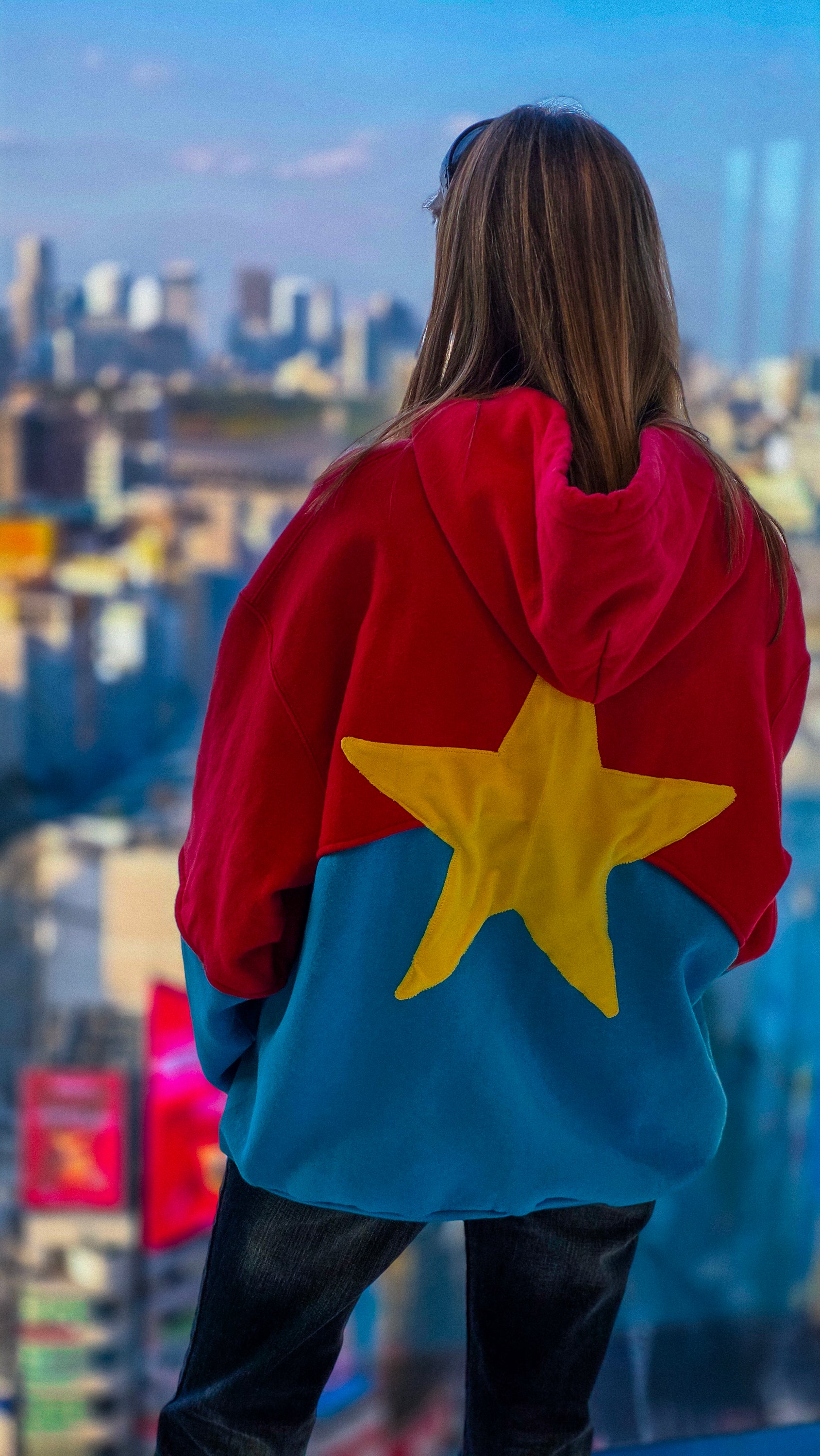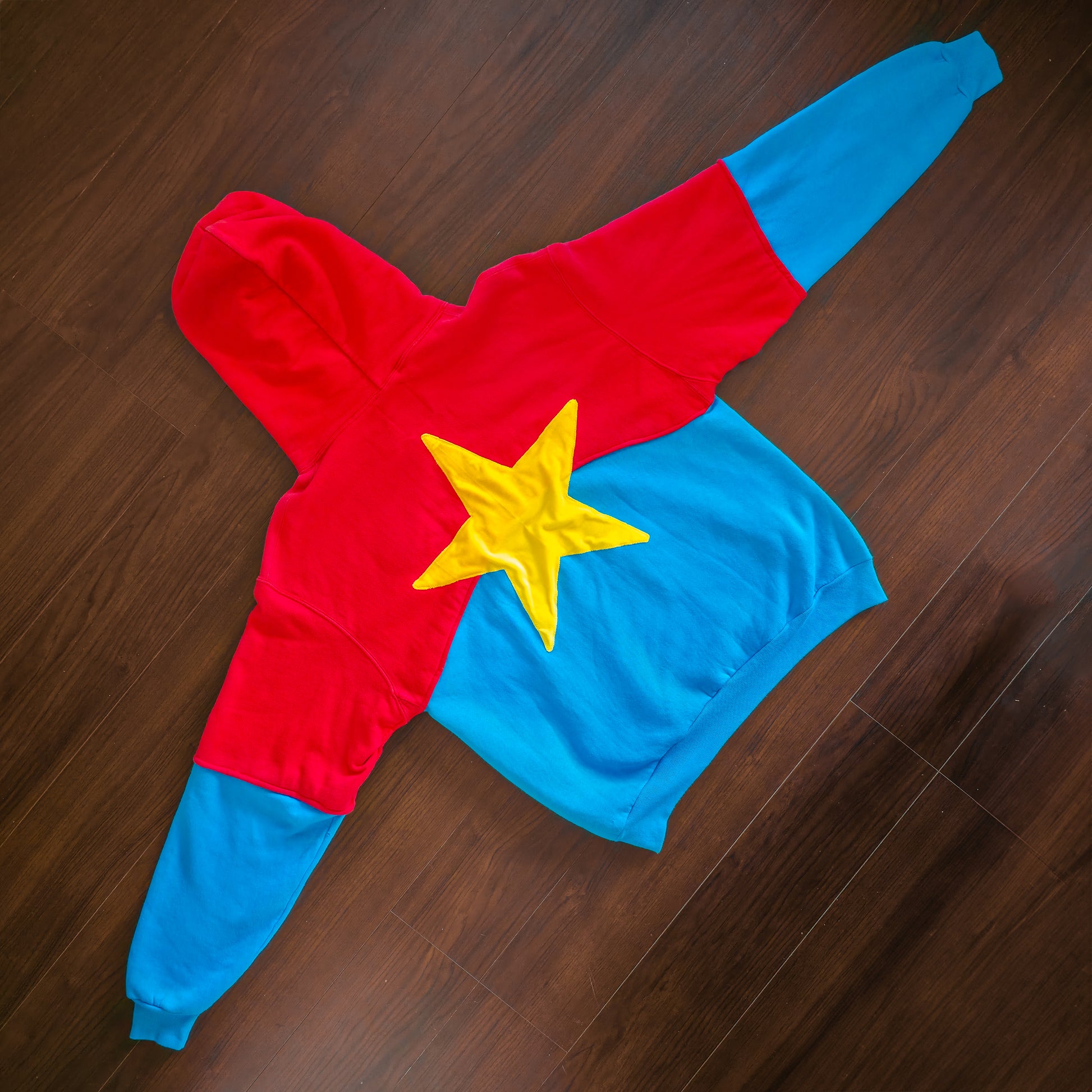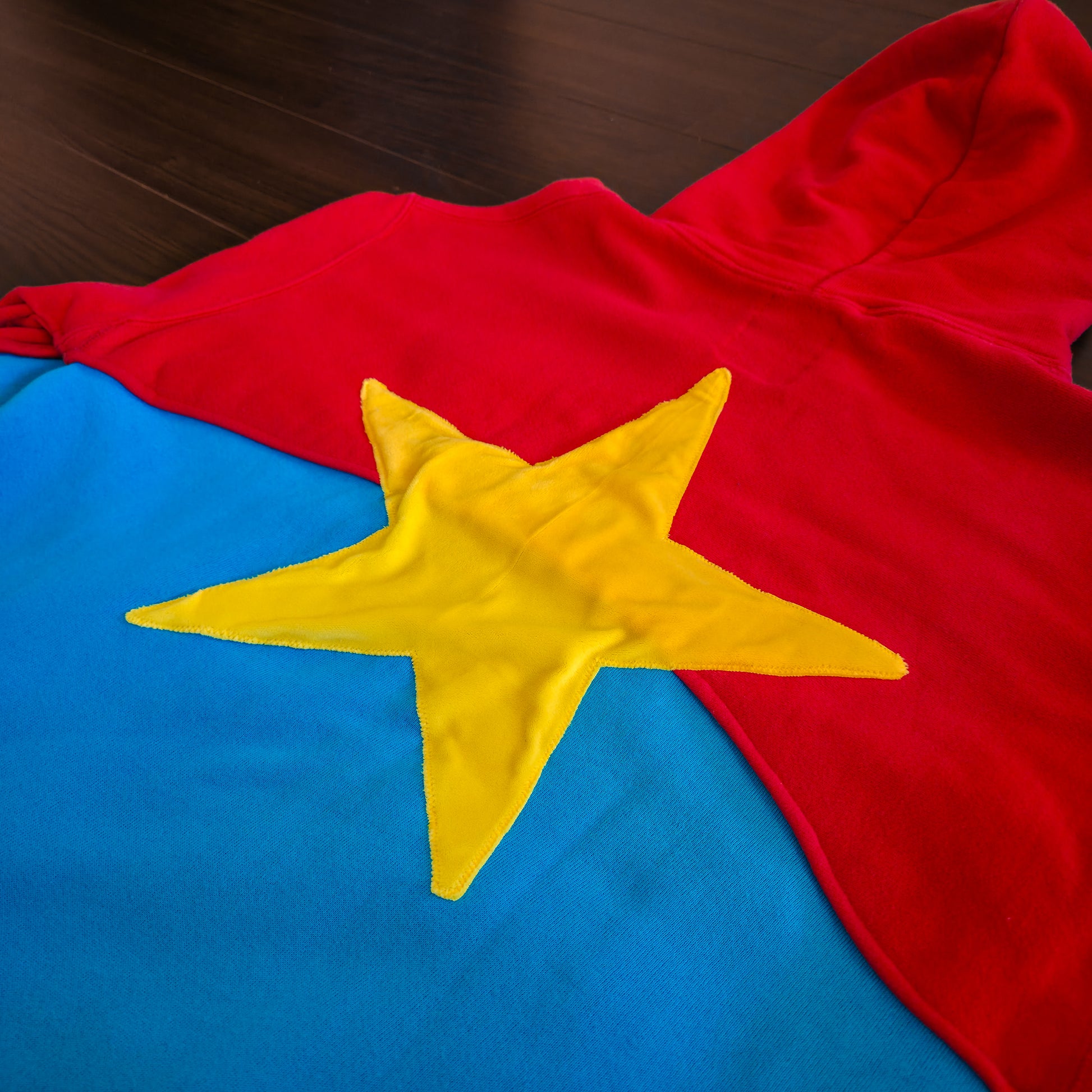 A 1 of 1, hand made cotton hoodie in blue and red with a yellow star across the back, displaying the flag of the National Liberation Front of South Vietnam (also known as the Viet Cong).