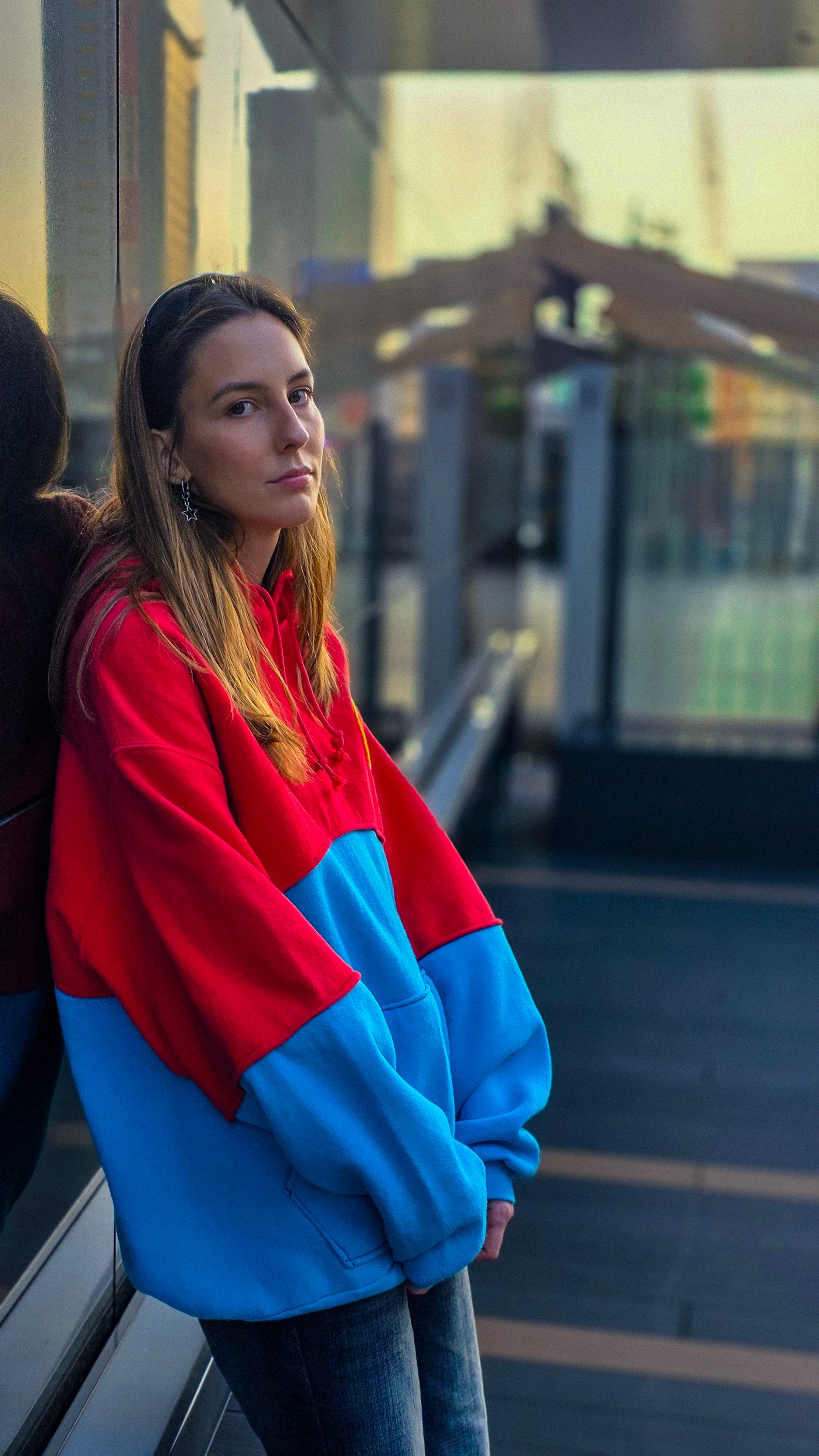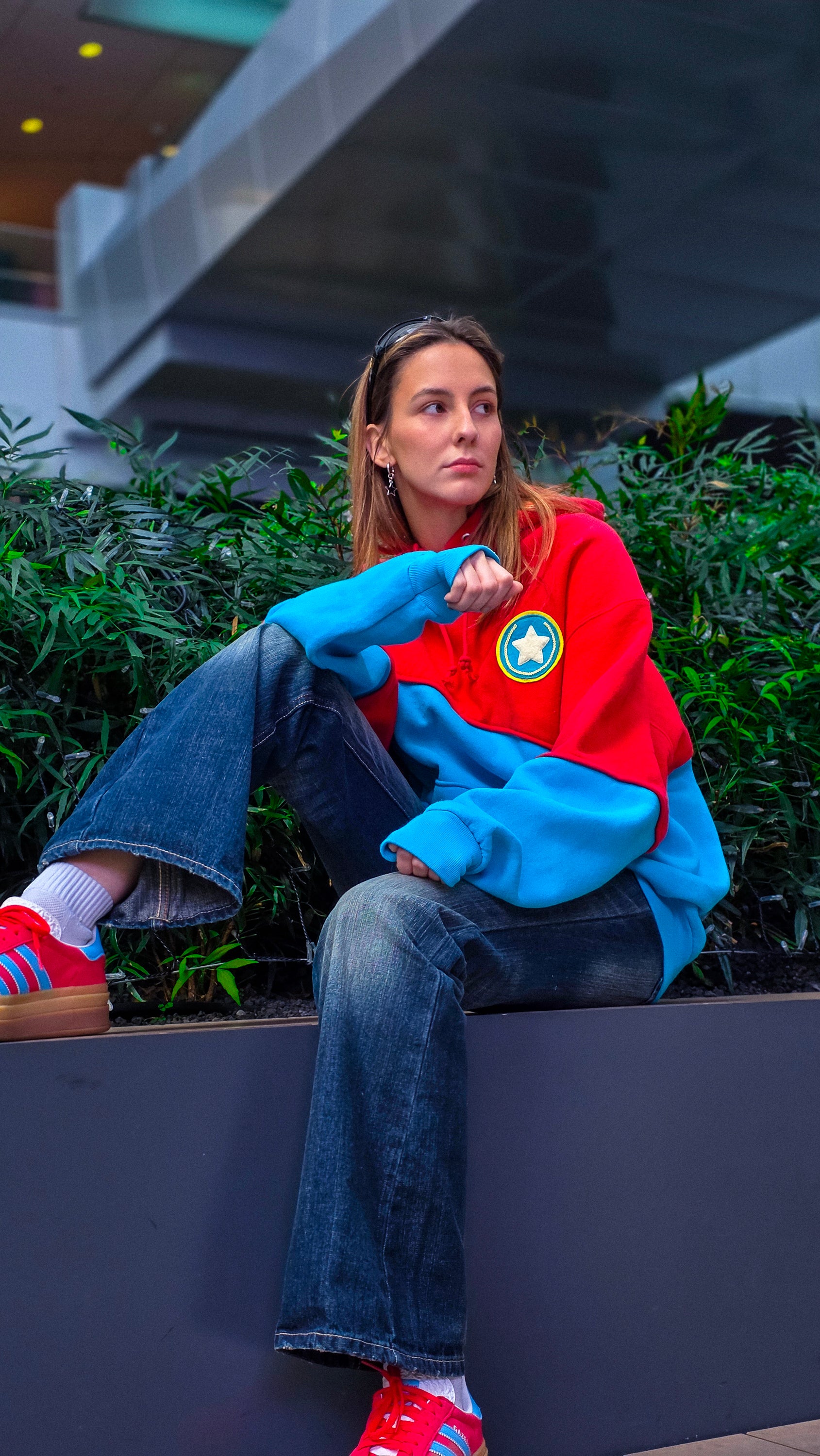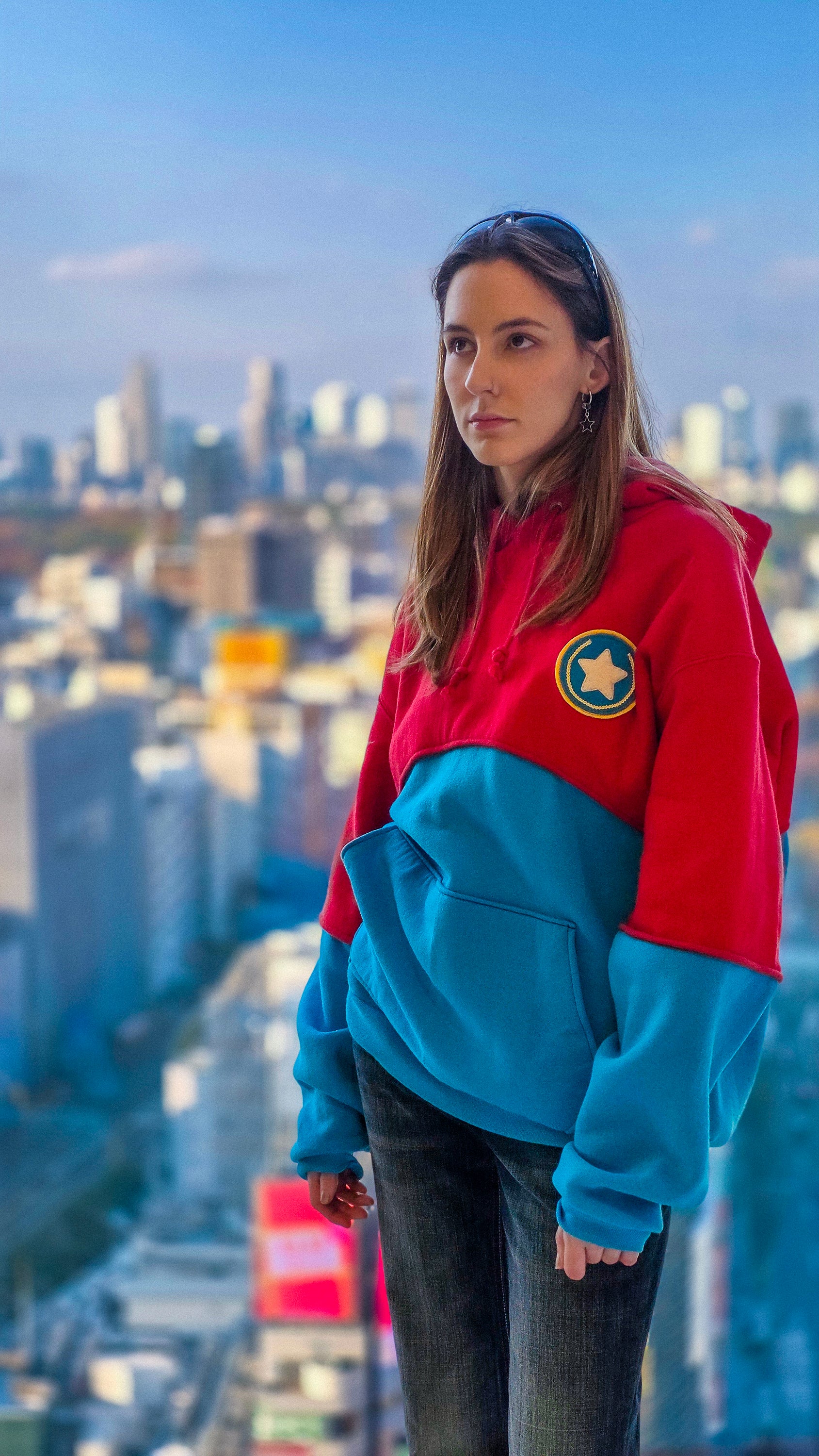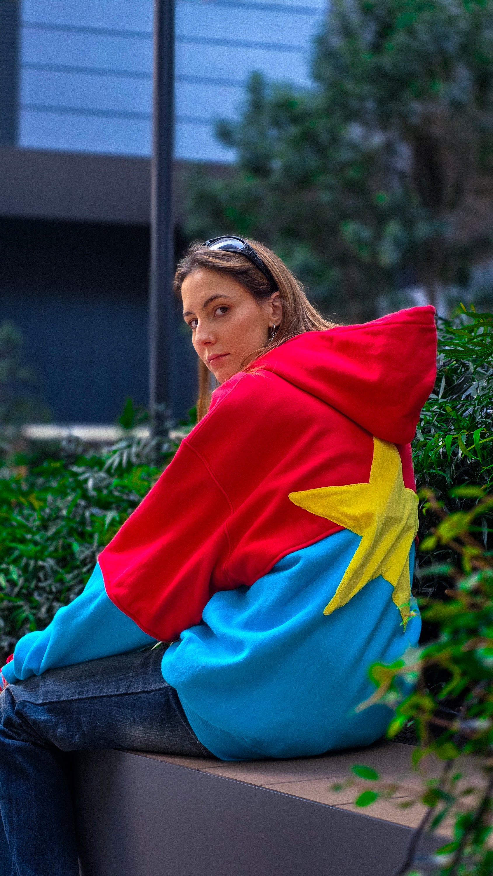 A 1 of 1, hand made cotton hoodie in blue and red with a yellow star across the back, displaying the flag of the National Liberation Front of South Vietnam (also known as the Viet Cong).